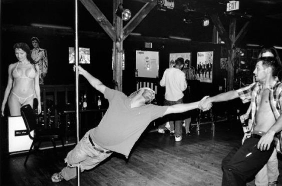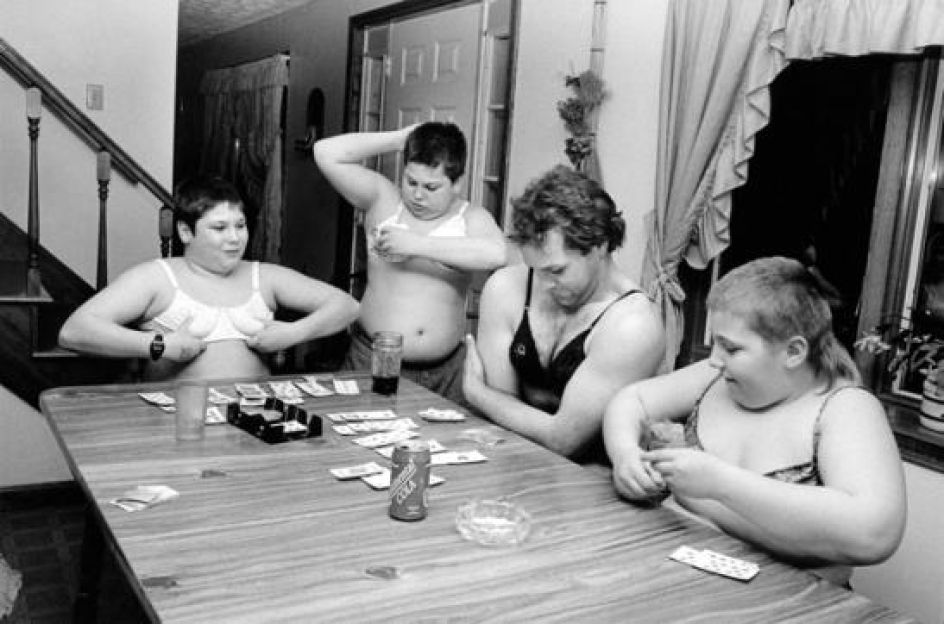 Spanning the years from 1990 to 2011, these images show family rituals and traditions, drunken exploits and quieter moments of reprieve. They show a dog in cowboy boots. Boys playing cards in bras. College kids streaking through farmland. A juxtaposition of pregnant bellies and beer bellies that is both absurd and oddly tender.