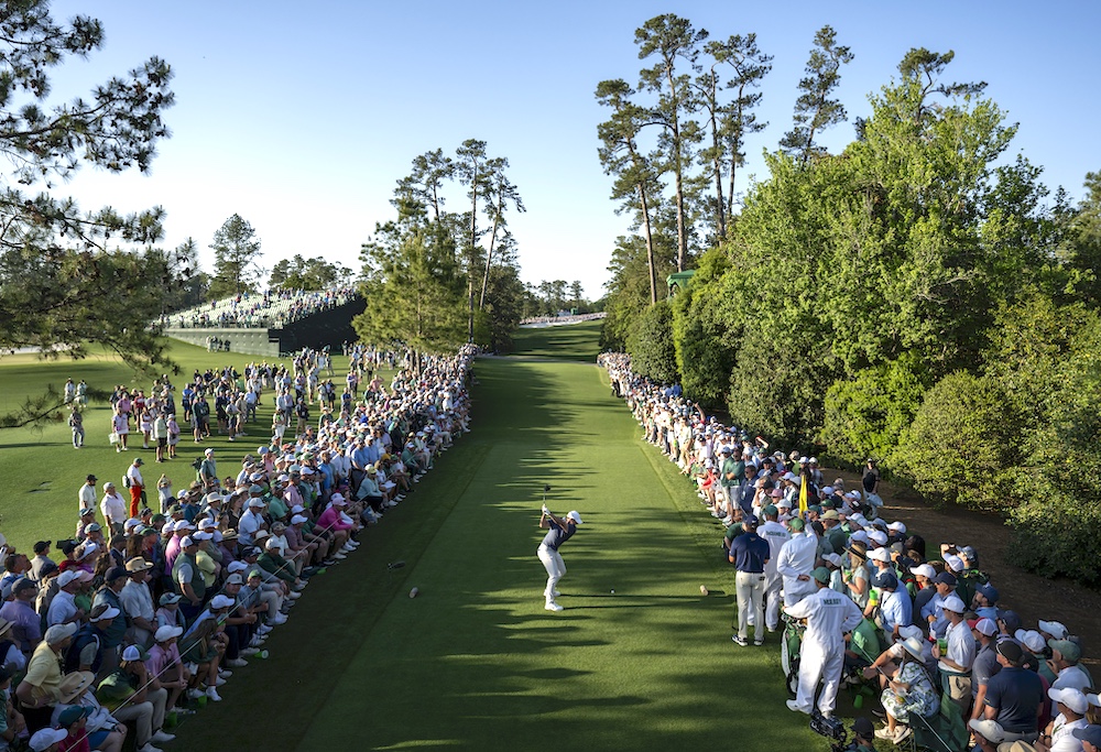 Rory McIlroy hits his drive on the 72nd hole of the 2025 Masters, which he ultimately won in a playoff. Joel Marklund, Courtesy Augusta National