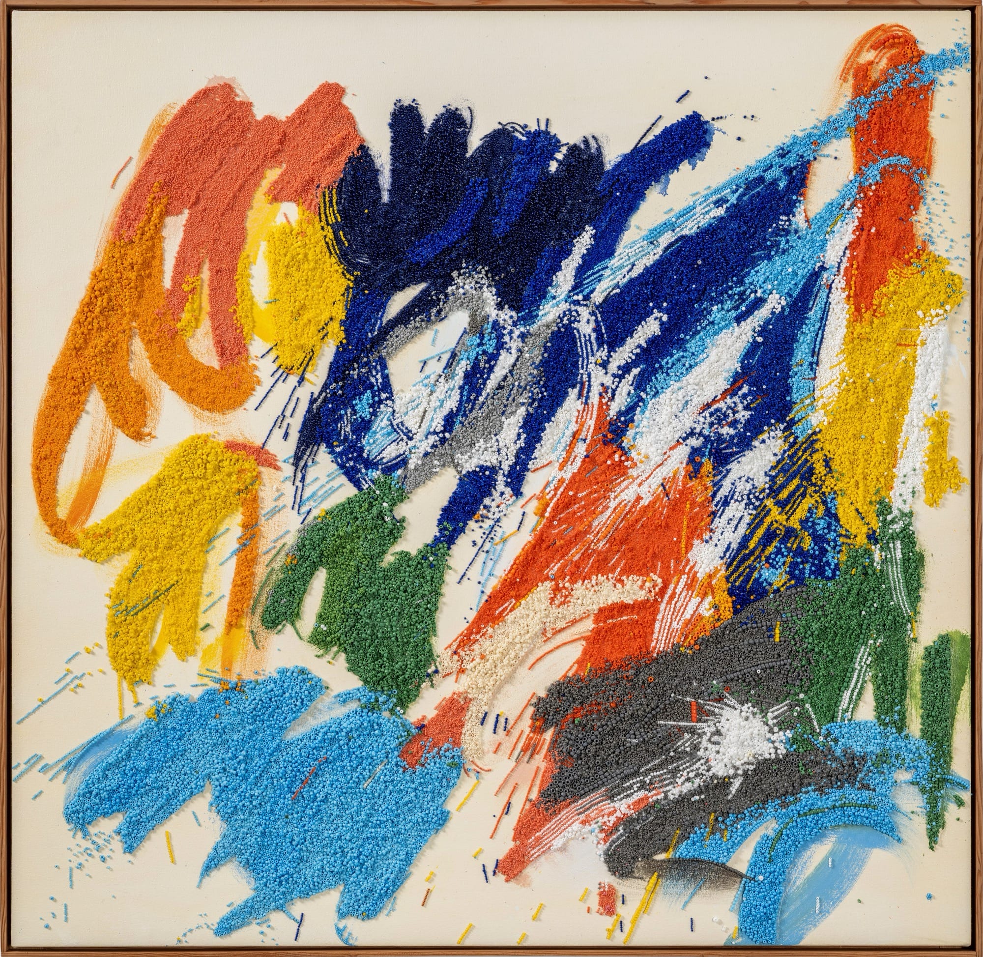 An Abstract Expressionist mixed-media painting by Liza Lou with thousands of colorful beads representing brushstrokes“Analepsis” (2025), oil paint and glass beads on stretched canvas, 42.75 x 41.75 x 1.75 inches