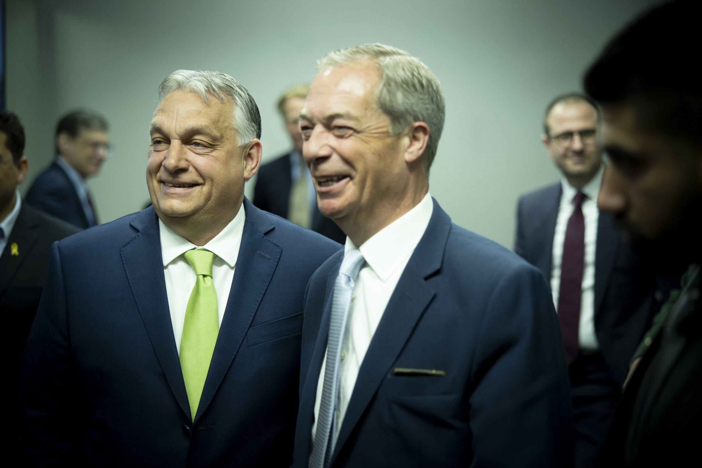 Hungarian prime minister Viktor Orbán and Nigel Farage at the National Conservative Conference (NatCon) in Brussels, 2024. (Photo: MTI)