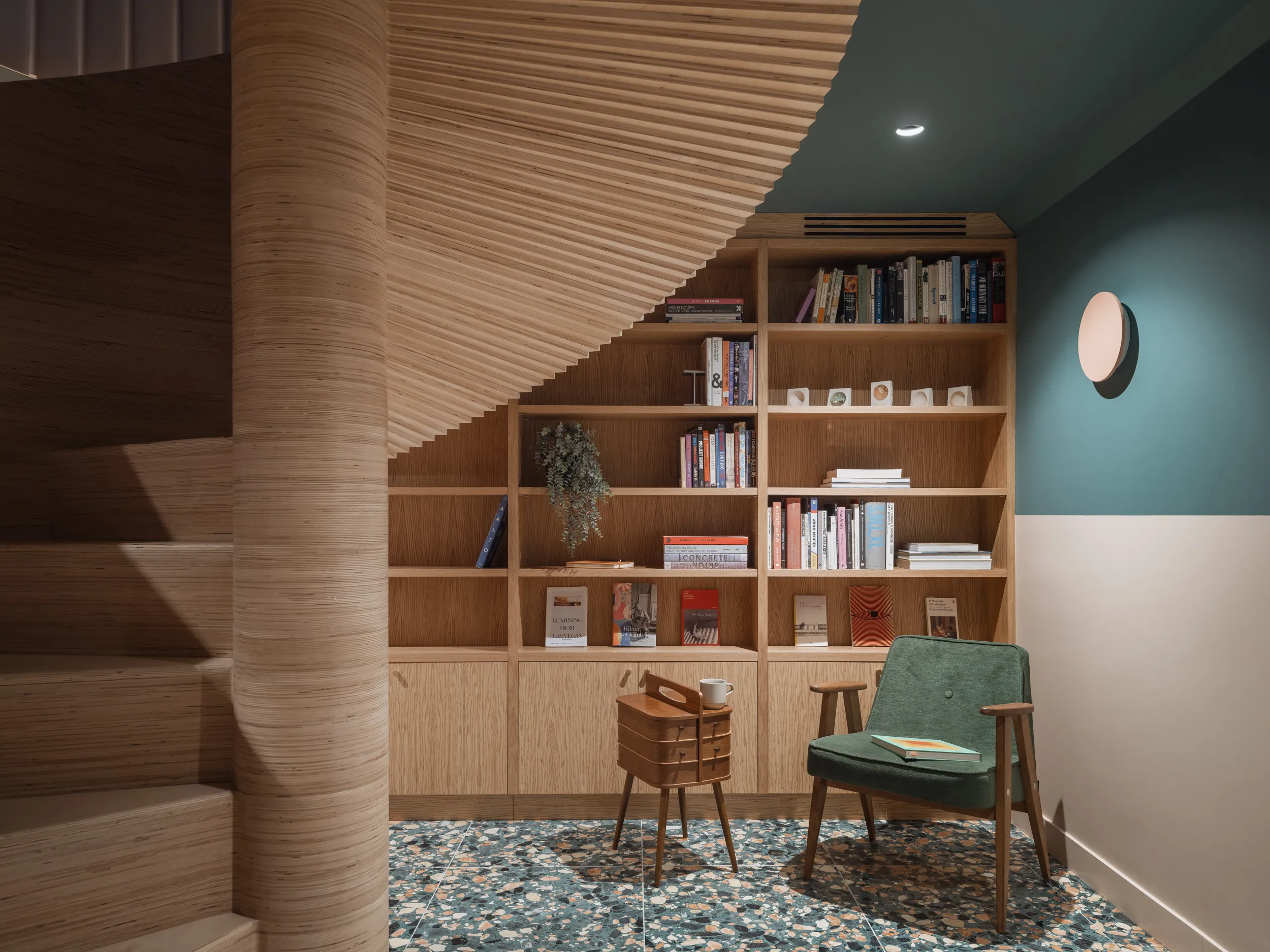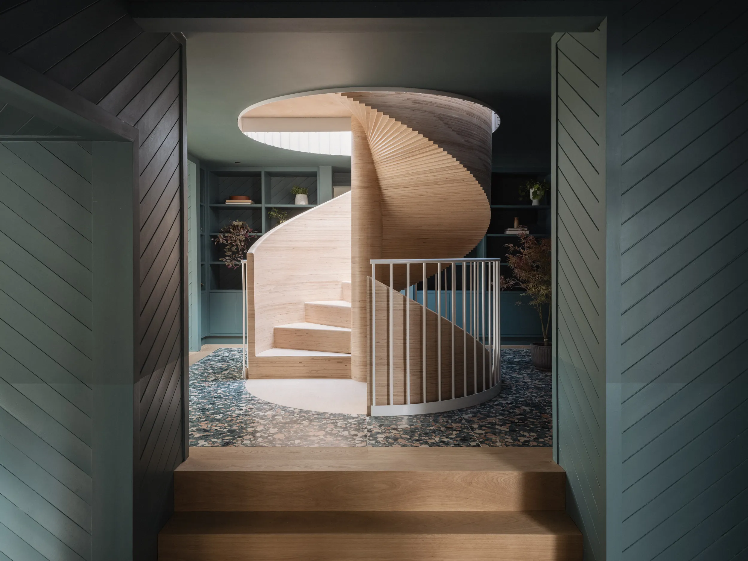 The birch timber treads, prefabricated in Liverpool by Landmark Joinery, were individually cut and hand-layered to form a smooth, sinuous parabolic curve.