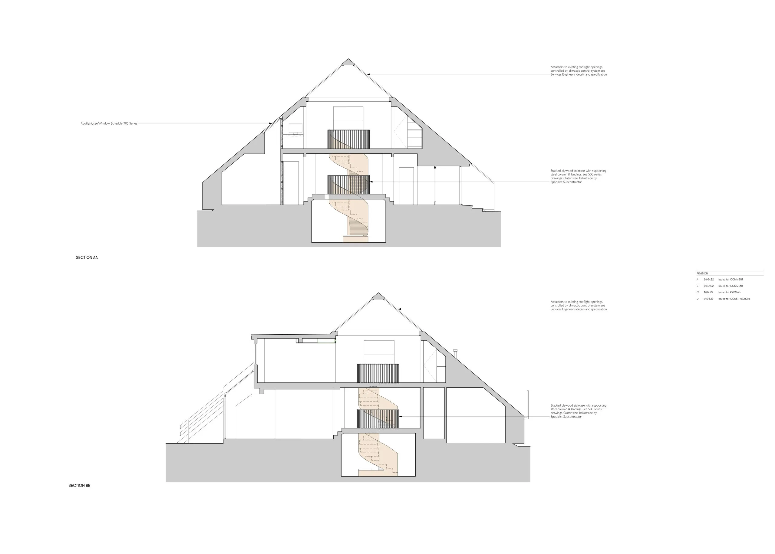 The five-bed house is divided into a ‘triptych’ of spaces, categorised as working, living and rest, reorganising the spaces to enhance the house’s circulation within the tapering volumes on each floor.