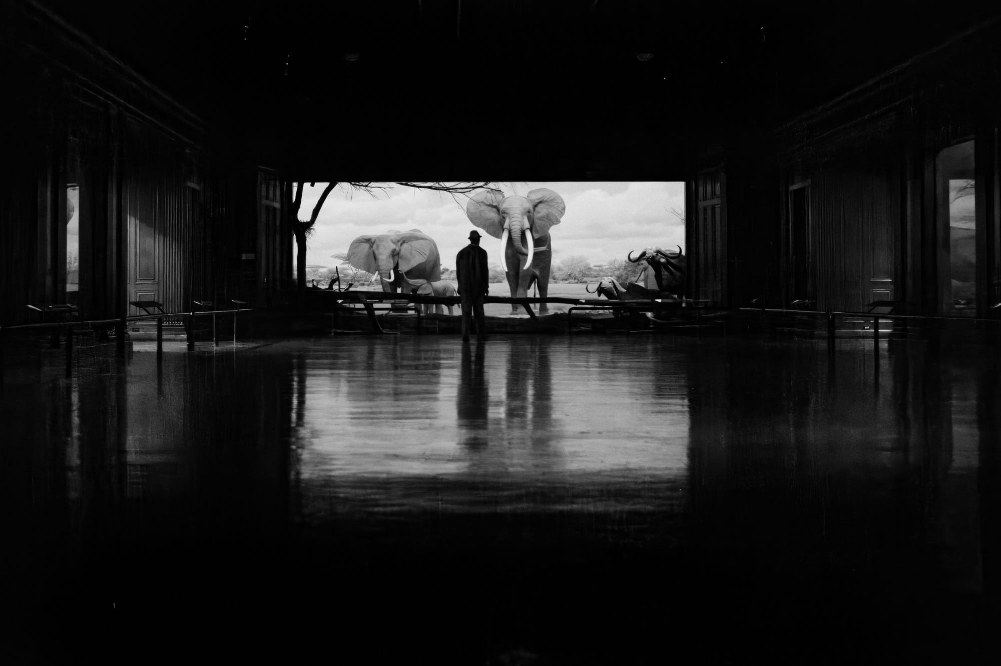 a black-and-white photograph by Daniel Sackheim in a noir style of a man looking at a diorama of elphants“900 EXPOSITION BLVD”