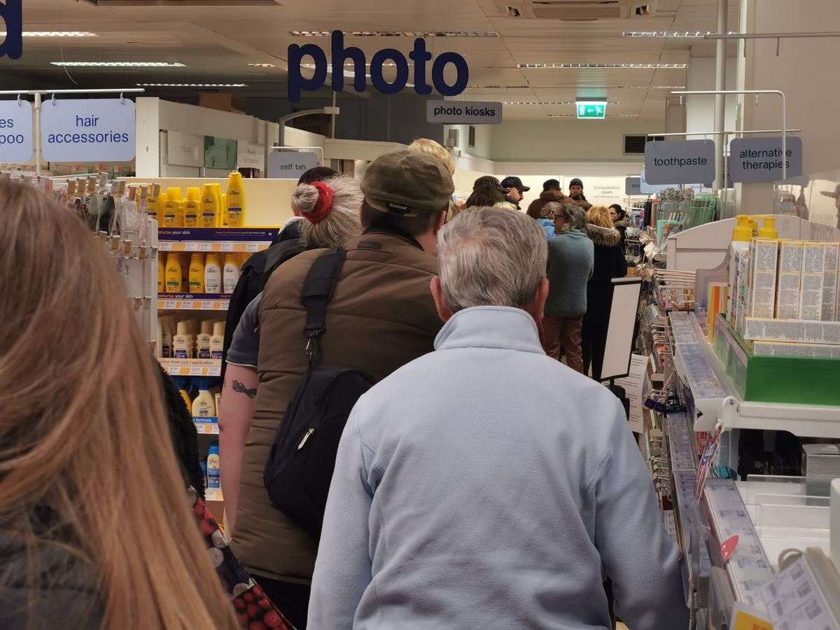 A queue in Boots for the pharmarcy where people had been waiting for well over an hour