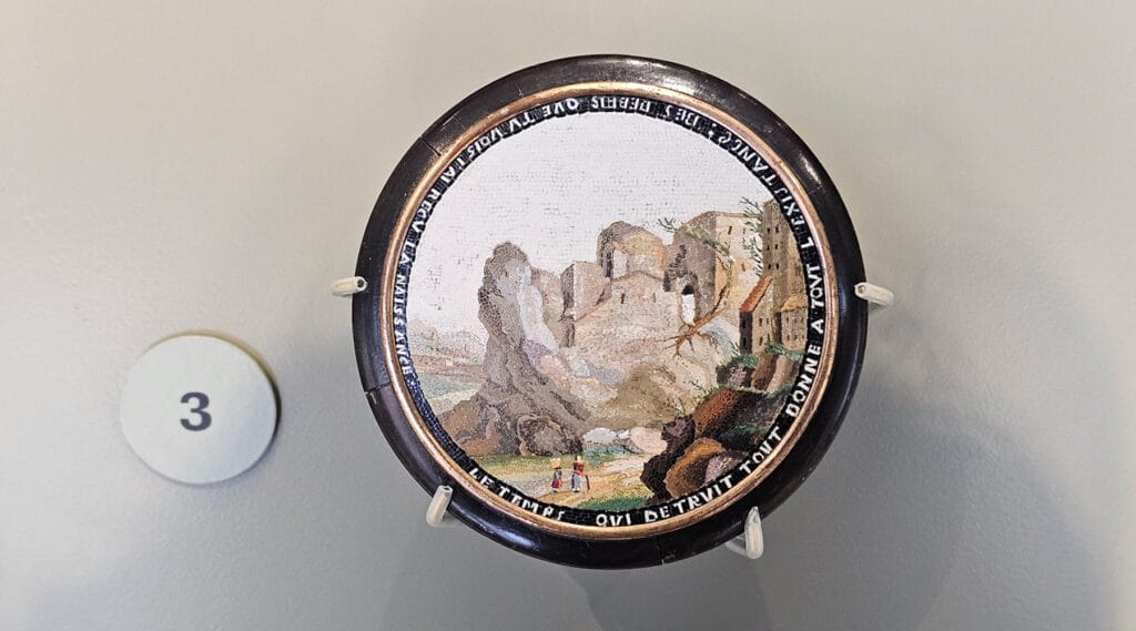 A micro-mosaic landscape doubles as a hidden human profile, while a necklace depicting views of Rome turns the idea of a souvenir into wearable art. Alongside the objects, the gallery also explains the painstaking techniques behind them, adding another layer of appreciation.