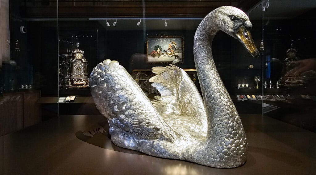 This fascination with miniature craftsmanship runs throughout the displays, often paired with a touch of social history through illustrious – and at times very dodgy – provenance. And while many objects are small, the collection isn’t exclusively so – the gleaming silver swan, made in 1985 for Gilbert’s Los Angeles home, is an unmistakable centrepiece, requiring four British craftsmen to create.