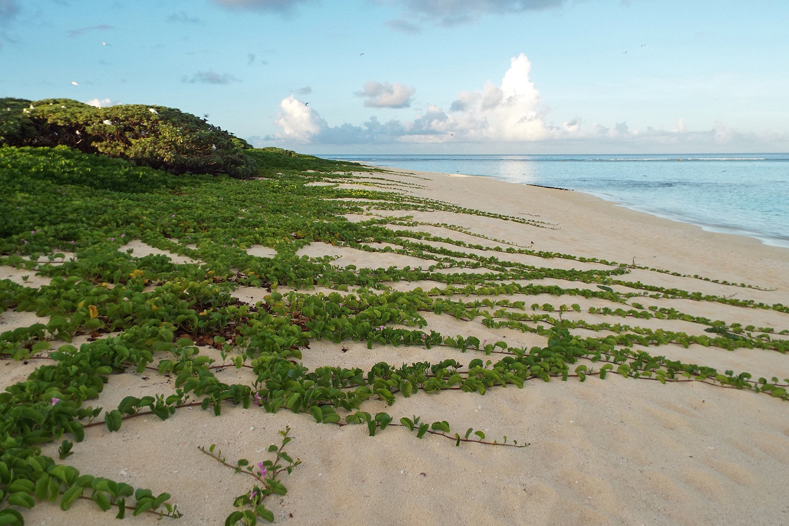 Beach morning glory is a pioneer species that helps stabilize coastlines by binding sand. Much as the root network of trees anchors soil and protect communities from landslides, the vine helps hold sandy shores together against abrasion.