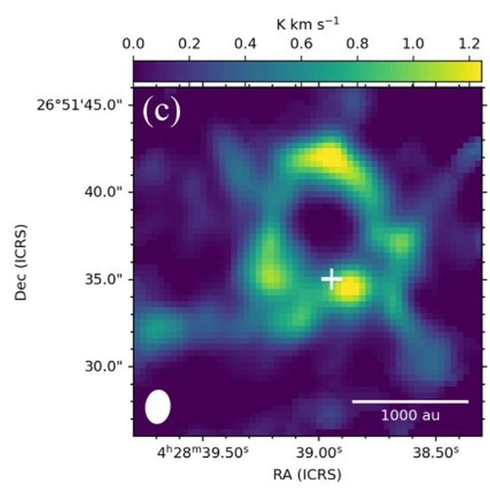 This is typical of scientific astronomical images. They're rich in data, but don't necessarily find their way into articles for non-astronomers. In this figure, the small white cross marks the protostar's location, and the large gaseous ring is easily seen. The image is called an integrated-intensity map of rotating carbon monoxide molecules that are releasing photons as they drop from one rotational energy level to another. In particular, this map traces warm, dense CO gas. Image Credit: Tokuda et al. 2026. ApJL *This is typical of scientific astronomical images. They’re rich in data, but don’t necessarily find their way into articles for non-astronomers. In this figure, the small white cross marks the protostar’s location, and the large gaseous ring is easily seen. The image is called an integrated-intensity map of rotating carbon monoxide molecules that are releasing photons as they drop from one rotational energy level to another. In particular, this map traces warm, dense CO gas. Image Credit: Tokuda et al. 2026. ApJL*