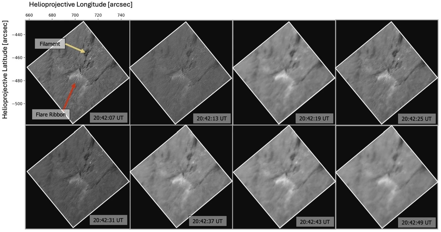 This sequences shows the evolution of a bright flare ribbon using the Visible Broadband Imager on the Daniel K. Inouye Solar Telescope. The flare occurred in active region 13078. Credit: Tamburri, et al. This sequences shows the evolution of a bright flare ribbon using the Visible Broadband Imager on the Daniel K. Inouye Solar Telescope. The flare occurred in active region 13078. Credit: Tamburri, et al.