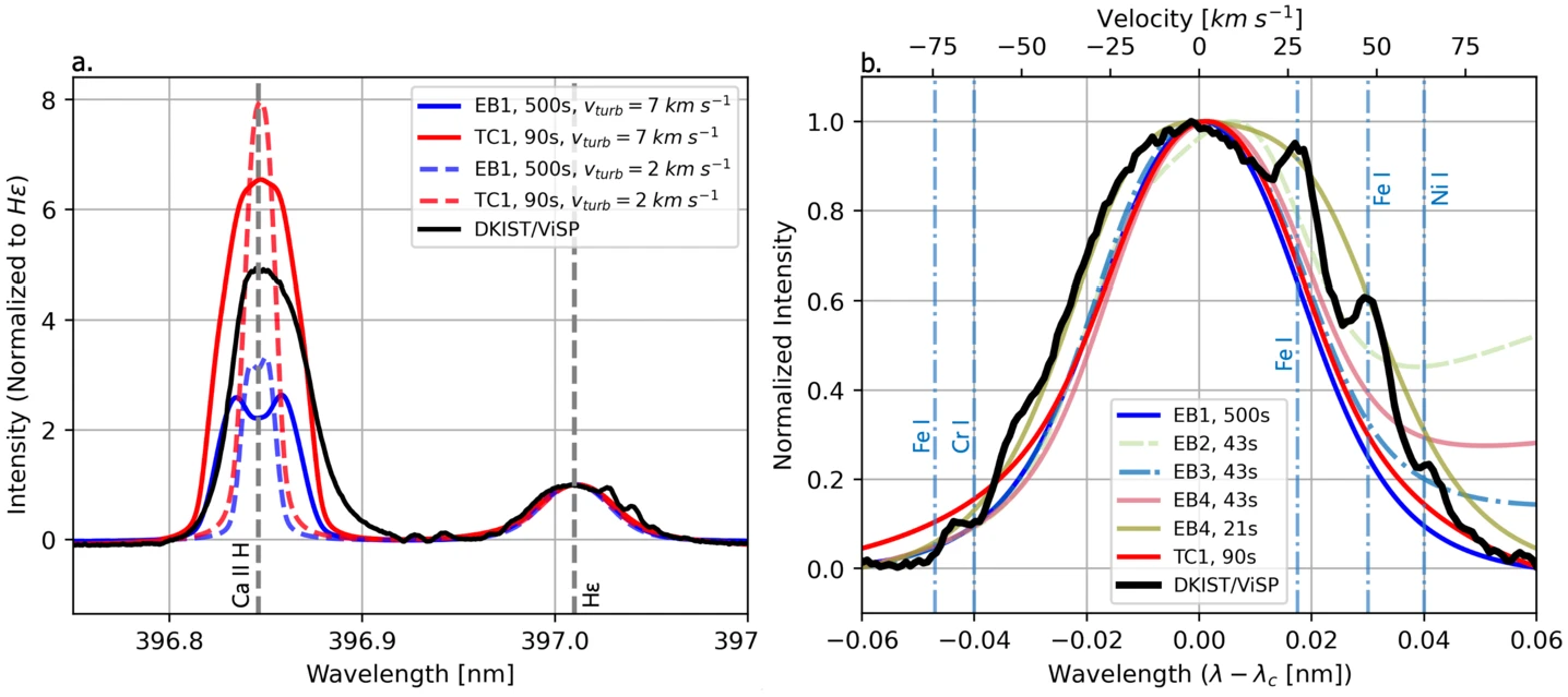 (a) A comparison of a RADYN+RH simulated Ca II H and H lines to observations made by the Daniel K. Inouye Solar Telescope.. (b) A comparison of ViSP observations to the modeled H profiles that are notably in emission in panel (a), using in the input RH atmosphere file. Note also the locations of several other lines within the spectral range of H, from Fe I, Fe I, and Ni I. The two Fe I lines in the red wing are deeper in the quiet Sun than the flare spectra, giving the impression of an emission line when the pre-flare is subtracted. Intensity values include pre-flare subtraction and are normalized to the maximum intensity of H in order to easily compare the widths of observed and modeled lines. The observed line profiles from ViSP at ribbon center at 20:42:07 UT are shown in black. This is a figure from a paper describing the observations (see references below). Courtesy Tamburri, et al. (a) A comparison of a RADYN+RH simulated Ca II H and H lines to observations made by the Daniel K. Inouye Solar Telescope.. (b) A comparison of ViSP observations to the modeled H profiles that are notably in emission in panel (a), using in the input RH atmosphere file. Note also the locations of several other lines within the spectral range of H, from Fe I, Fe I, and Ni I. The two Fe I lines in the red wing are deeper in the quiet Sun than the flare spectra, giving the impression of an emission line when the pre-flare is subtracted. Intensity values include pre-flare subtraction and are normalized to the maximum intensity of H in order to easily compare the widths of observed and modeled lines. The observed line profiles from ViSP at ribbon center at 20:42:07 UT are shown in black. This is a figure from a paper describing the observations (see references below). Courtesy Tamburri, et al.