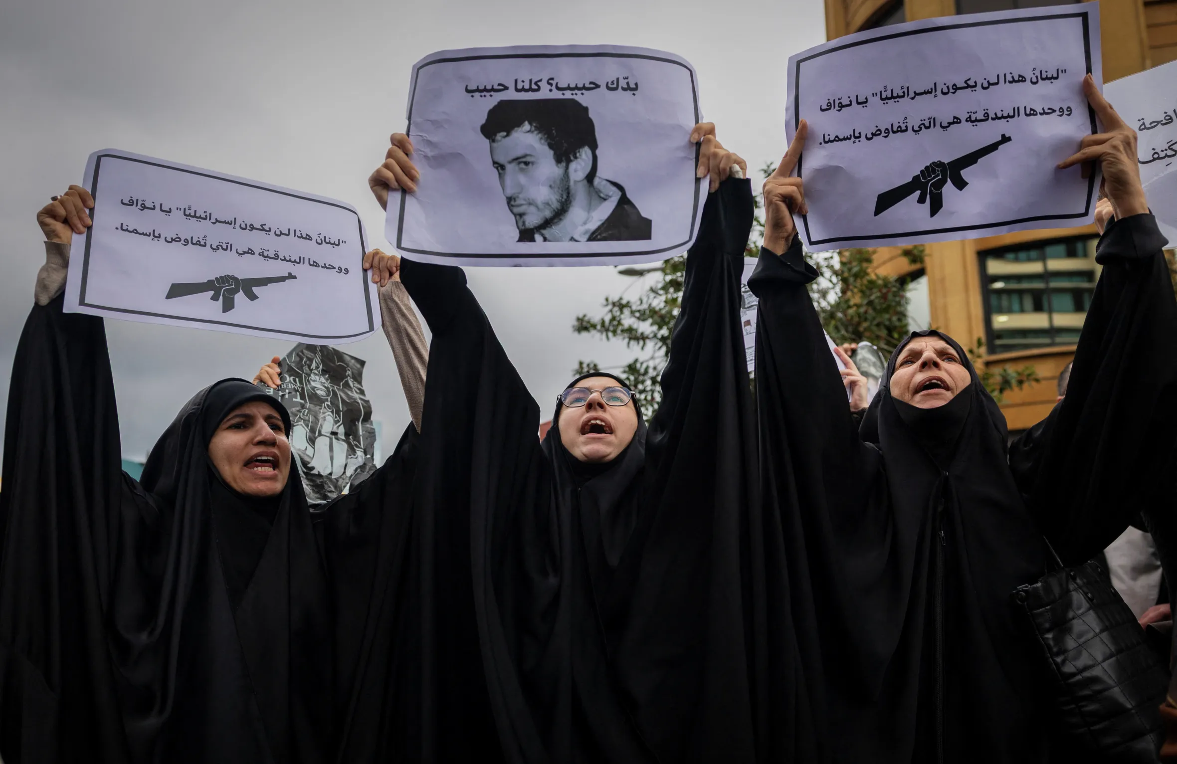 Protesters gathered outside the office of the Lebanese prime minister Nawaf Salam. Some waved flags depicting Hassan Nasrallah, the former leader of the Iran-backed group killed by Israel in 2024.