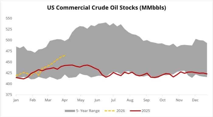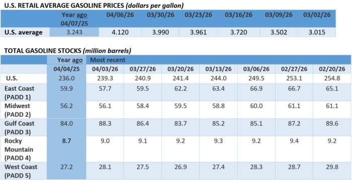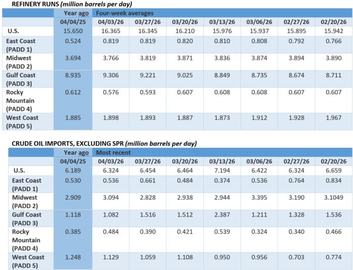 OPEC+ Output Collapses in March. According to S&P Global, members of OPEC+ slashed their combined production by 8.11 million b/d last month, seeing total output drop to 34.78 million b/d due to the closure of the Strait of Hormuz, with Iraq cutting the most as it shut in some 2.75 million b/d.