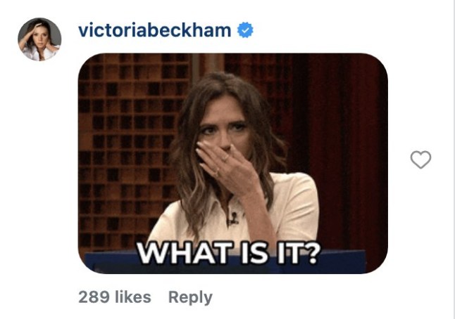 The fashion designer simply commented with a gift of herself looking stunned with her hand over her mouth, with the subtitle reading: ‘What is it?’