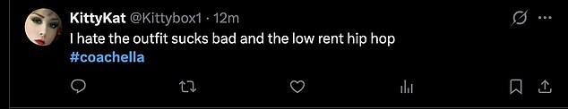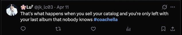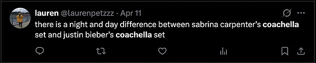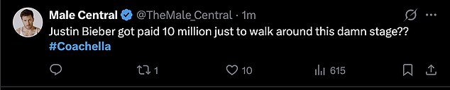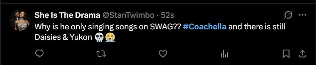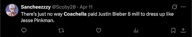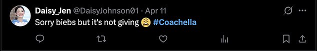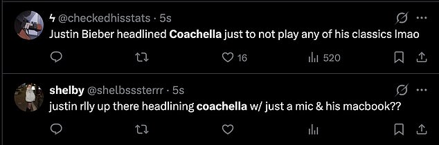 ‘Sorry biebs but it snot giving,’ one fan said gently, while another reacted more scathingly: ‘justin rlly up there headlining coachella w/ just a mic & his macbook??’