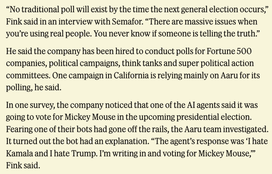 After the election, Fink told Semafor he was happy enough with those results because they were “within margin of error,” a term that is meaningless when applied to a “sample” of AI agents. And of course, Aaru says their models have improved since 2024, so supposedly now they’d be more accurate than the polls? Still, their stronger argument is on cost: “We are significantly faster and cheaper than traditional polling, and still more accurate,” said Fink. The first two claims there are undeniably true, but the third brings us to the opposite end of the spectrum.