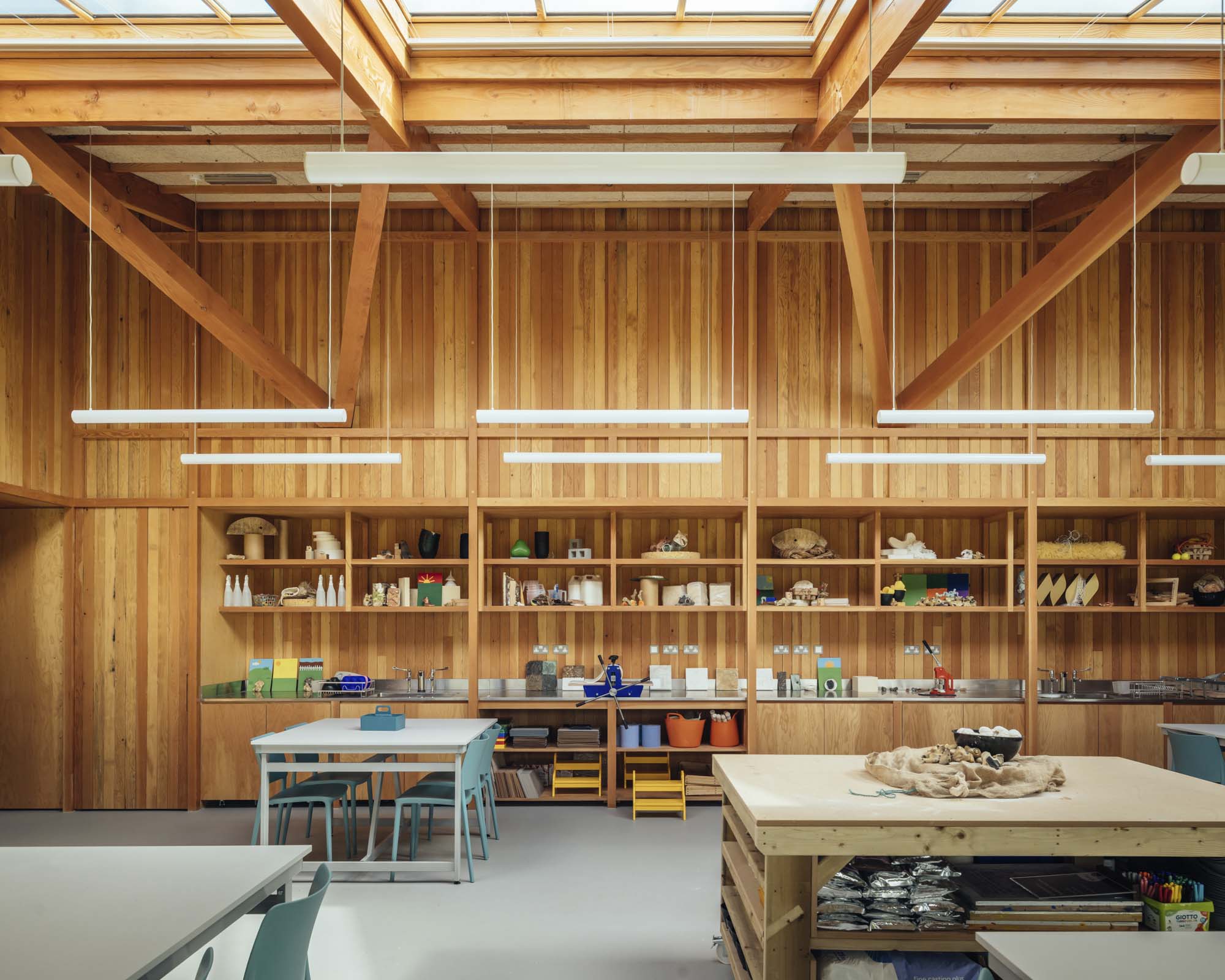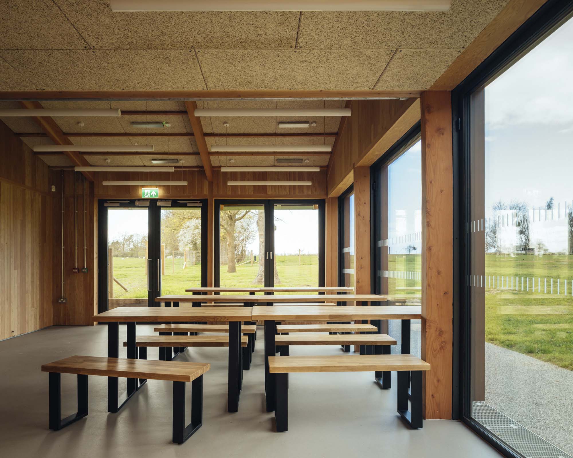 DSDHA has upgraded this structure and added learning and making workshop spaces for students and visitors, accommodated in a simple lean-to ‘cart shed’ extension. This both extends the existing steel frame by one bay and adds a Douglas fir timber structure to the west, which sits on reusable steel screw pile foundations.