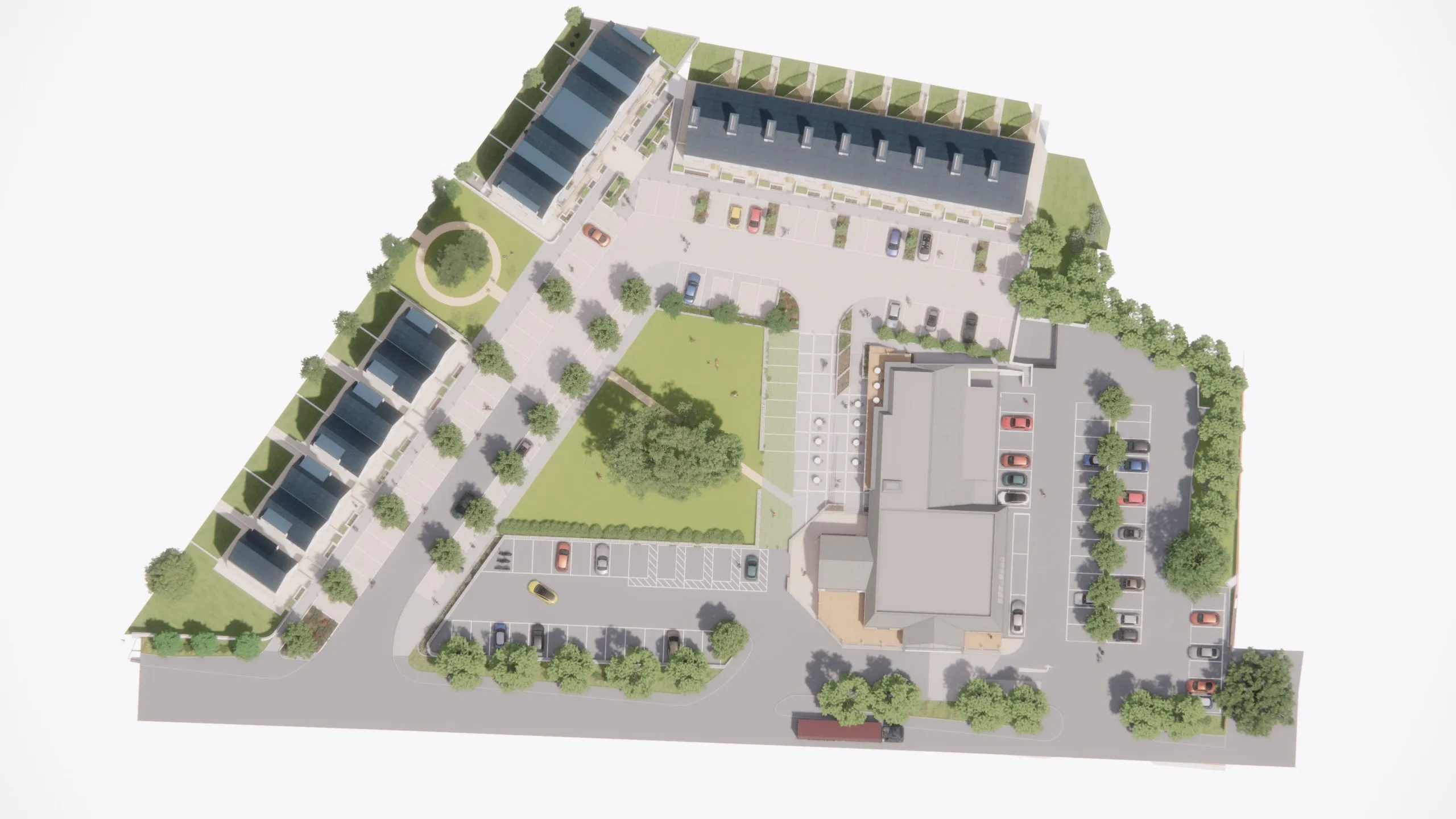 The scheme for pub operator Gramps Inn will replace a ‘dated’ 1970s motel and a major car park with a neighbourhood of terraces, semi‑detached houses and flats arranged around a new community green. The approval followed nearly four years of negotiation with the local authority.