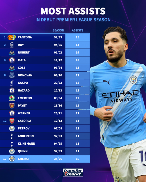 We’ve analysed the data to find out which players have provided the most assists in their debut Premier League season. Cherki’s pass to Guehi was his 10th Premier League assist of the campaign and that ranks joint-17th in history. As City still have seven league games remaining, Cherki could feasibly climb the list and even challenge Éric Cantona’s record. As the graphic below illustrates, Cantona registered 15 assists across the maiden Premier League campaign in 1992/93.