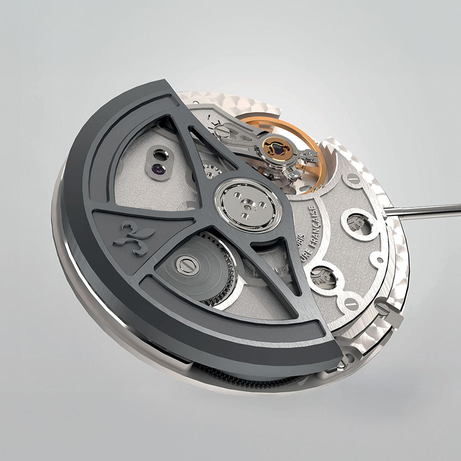 The opaline matte off-white dial is refreshingly contemporary and plays with different textures and heights. Perhaps the most distinctive feature of the dial is the smooth circular trench placed between the peripheral and recessed tachymetre scale and the central area of the area. Straddling the trench, the sharply faceted hour markers connect the two grained areas of the dial. The bold grained finish in the centre contrasts well with the two large, horizontally aligned sub-dials. Available in blue or red, the snailed decoration of the recessed sub-dials plays with the light, while their white markings echo the dial tone. The only touch of luminescence is found on the sharp hour and minute hands. The dial is protected by a domed, glass-box-style sapphire crystal.