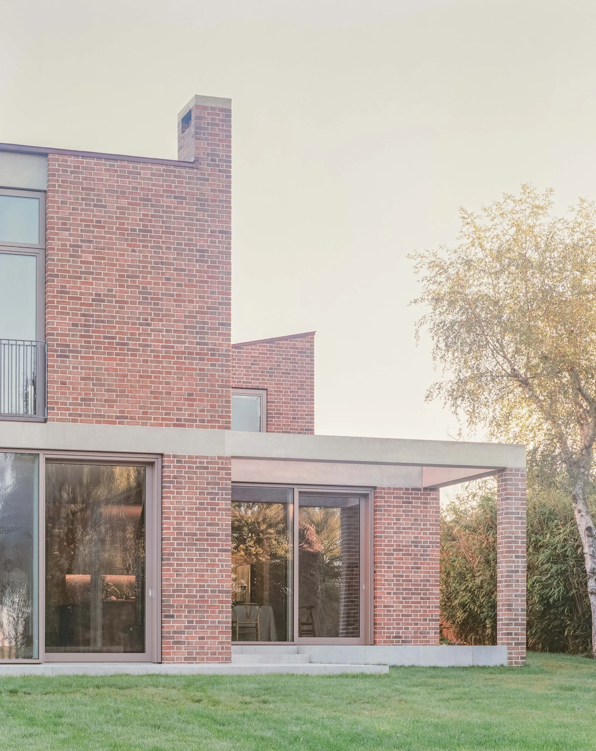 The house has been built from a simple palette of robust self-finished materials, which will weather naturally, develop character and reflect the tonal and textural qualities of the site and the surrounds. Externally, a waterstruck soft red brick laid in lime mortar is accented with precast concrete elements and copper standing seam roofs.