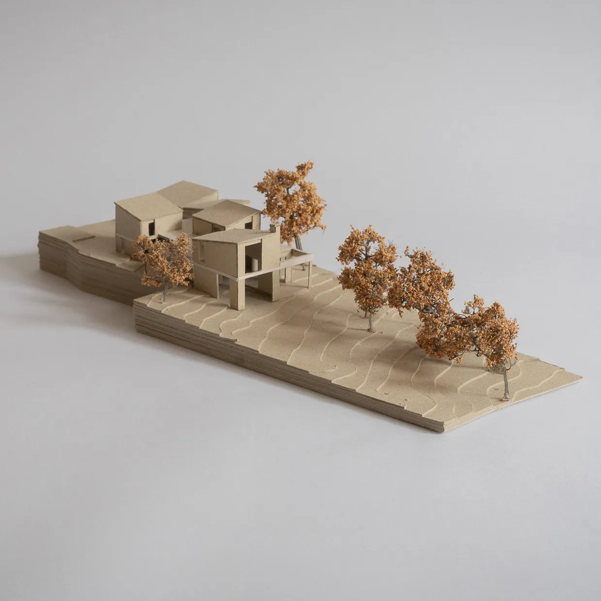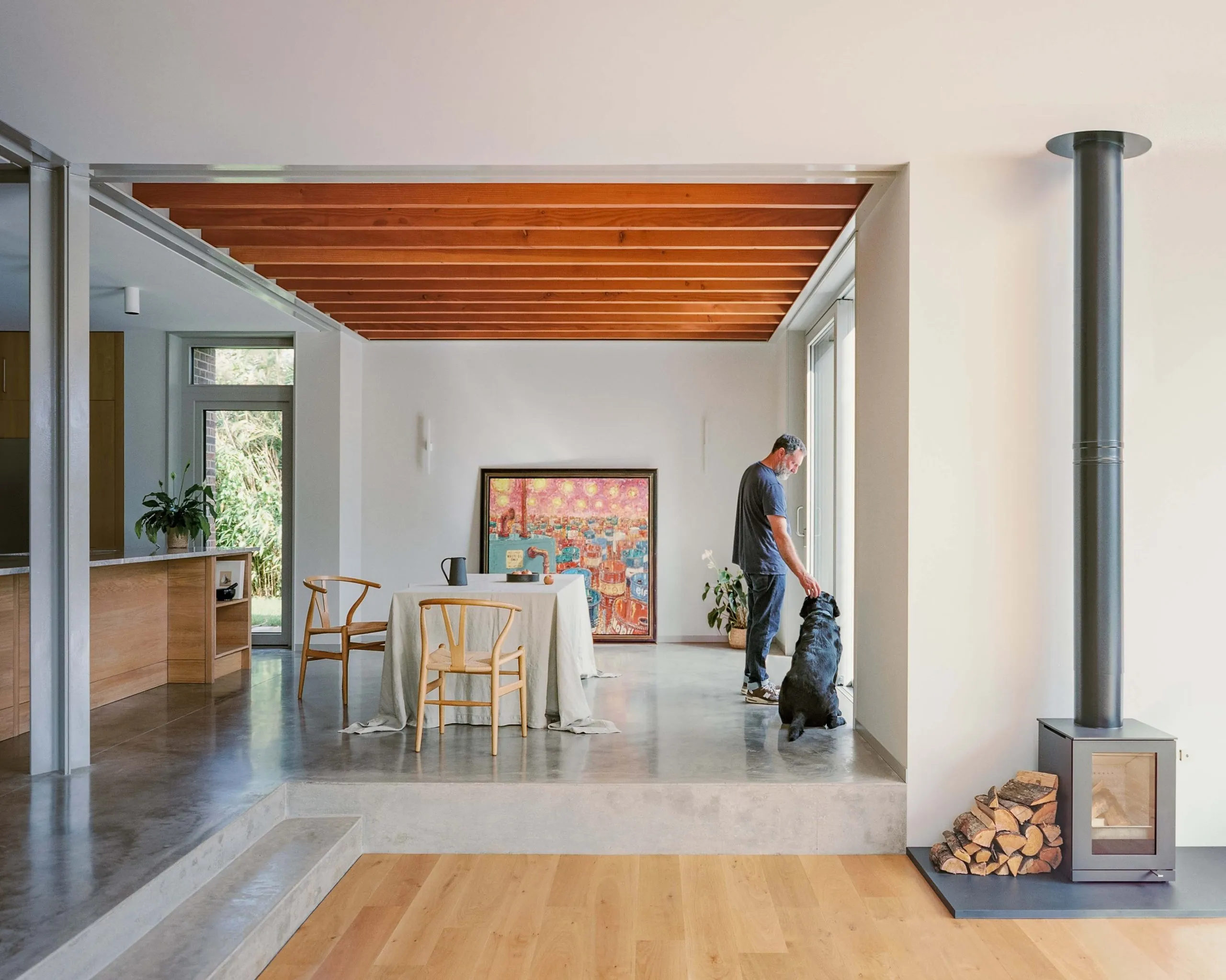The house follows a slope, gradually stepping down and offering increasingly generous ceiling heights in the principal living spaces.