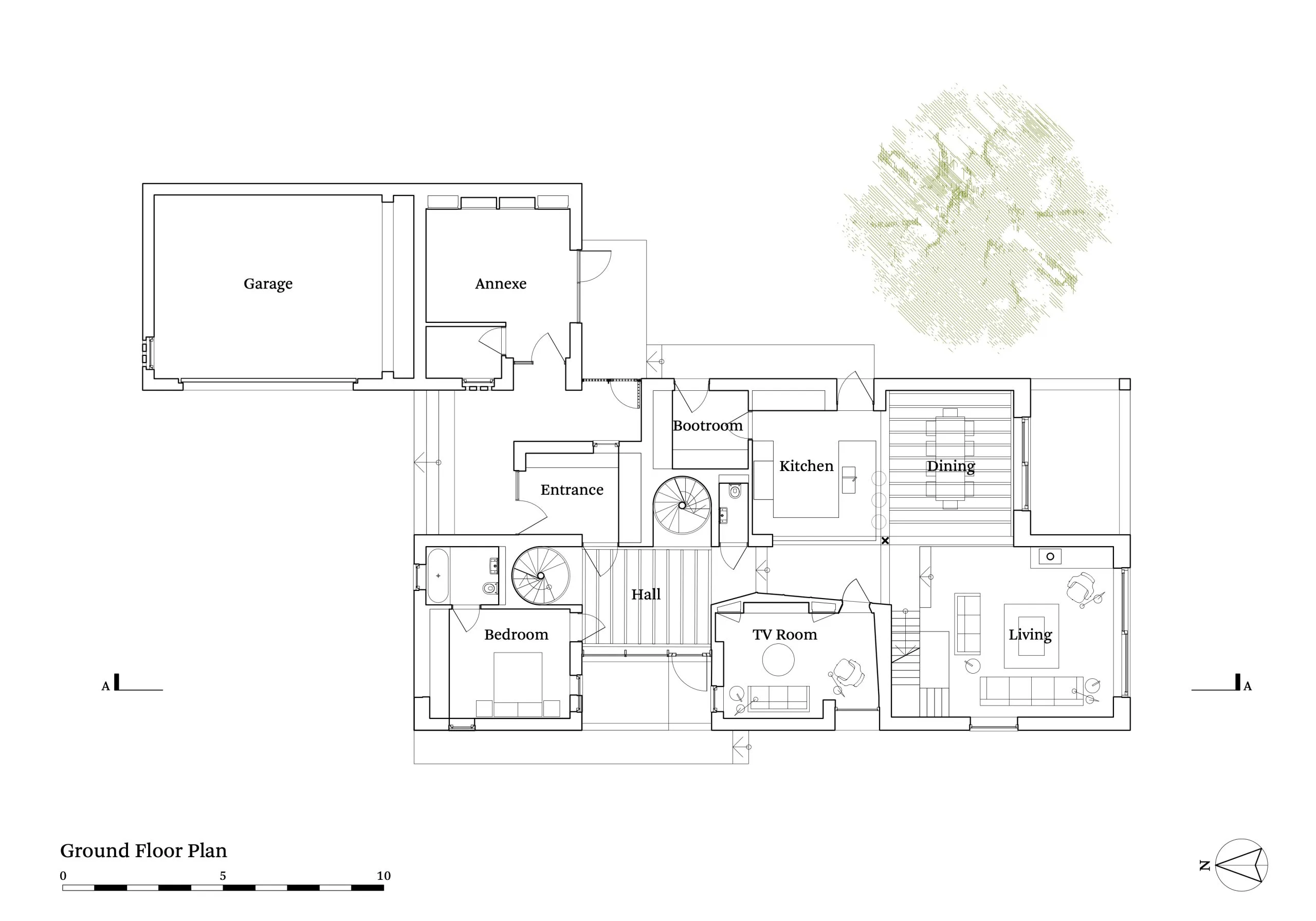 A covered external link connects the main house to a separate single-storey garage and annexe wing, framing the entrance yard. Within this is a ground-floor bedroom and flexible space designed to suit a variety of functions, ranging from a home office and gym to a small Airbnb let.