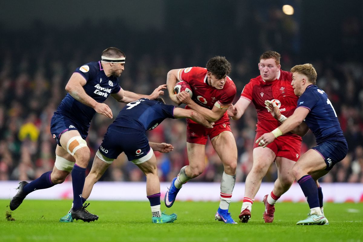 Wales’ Eddie James (centre) is tackled by Scotland’s Josh Bayliss (left), Ben White (second left) and Kyle Steyn (right) (Image: PA Wire)