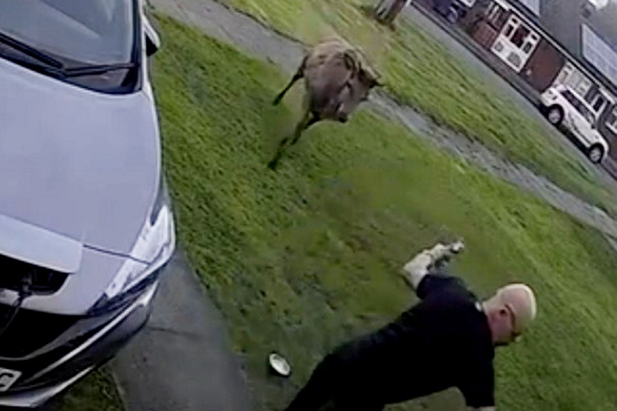 This is the comical moment a dad took a painful tumble as he was charged by an angry deer outside his Staffordshire home – moments after telling it: “I’ll f*****g smash ya”. Andrew Price, 58, went crashing through his front door as he fled the stag while trying to give it some water outside his property in Cannock.