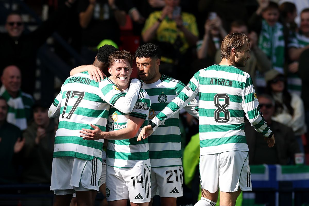 Luke McCowan of Celtic celebrates scoring his team’s fourth goal with teammates