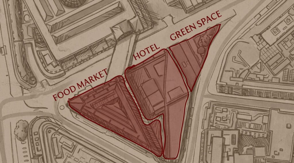 The first phase, opening in early 2028, will see a new food market opening in the buildings. Later, by 2030, there will be more retail spaces and a hotel opened, as well as the conversion of a disused service area into a central pocket park.