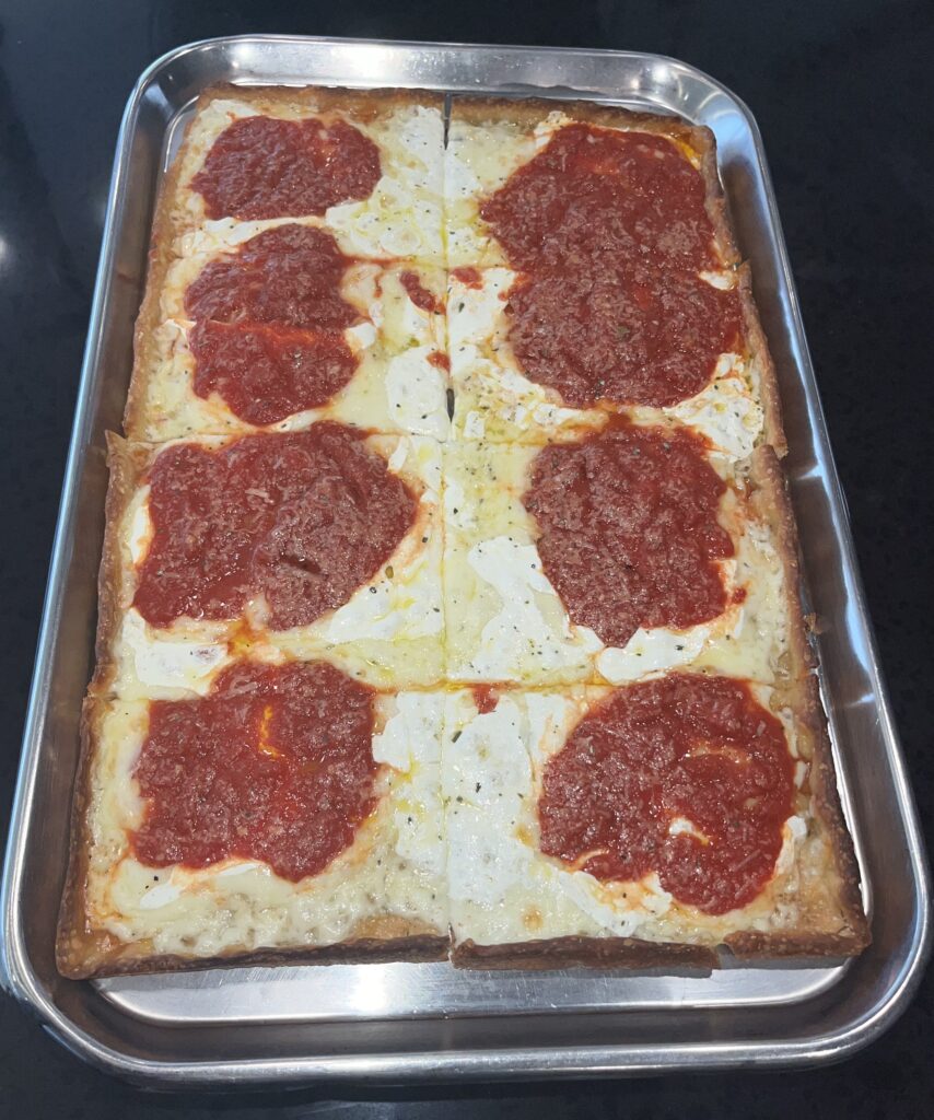 Bravo’s NYC menu includes a solid lineup of pizza styles beyond the standard cheese slice. The Grandma pizza, topped with mozzarella, fresh mozzarella, pecorino romano, and extra virgin olive oil over a signature marinara, has been a standout at the Manhattan location. The baked ziti pizza and vodka penne pizza are the kind of creative dairy combinations that tend to go over well with a crowd that knows its pizza. Garlic knots, pastas, and catering options round out the menu.