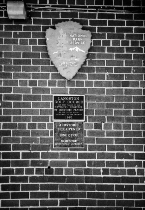 A plaque notes the opening of Langston Golf Course in 1939. Langston Golf Course