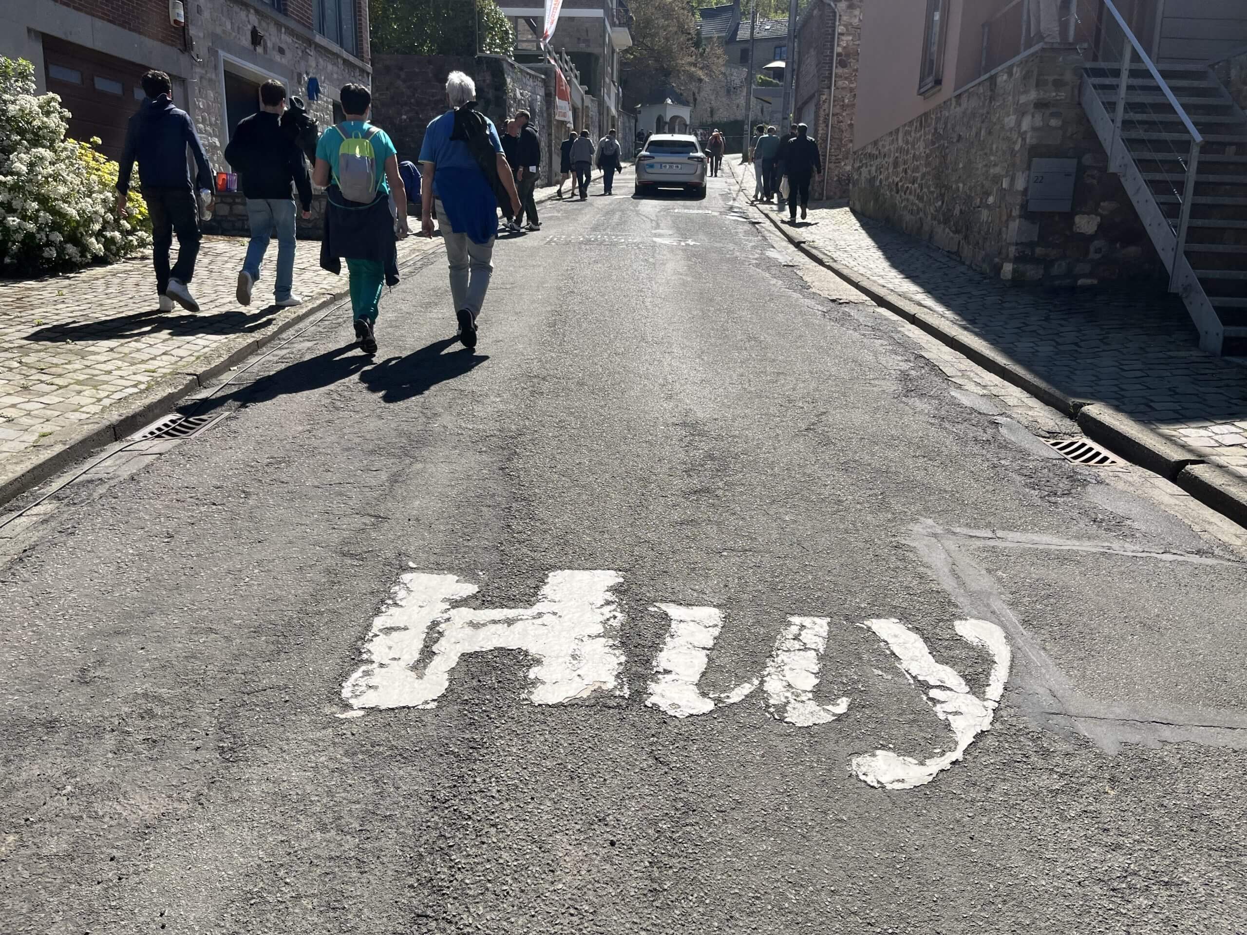 Here, the Mur caps the horizon of both the landscape and the imagination. ‘Huy’ is stencilled every twenty metres across the road, a guttural syllable — say a hard ‘h’ and rhyme it with oy — which suitably evokes both romance and the need to retch, its ‘u’ italicised on the tarmac as if it, too, has run out of energy and slumped to the side.