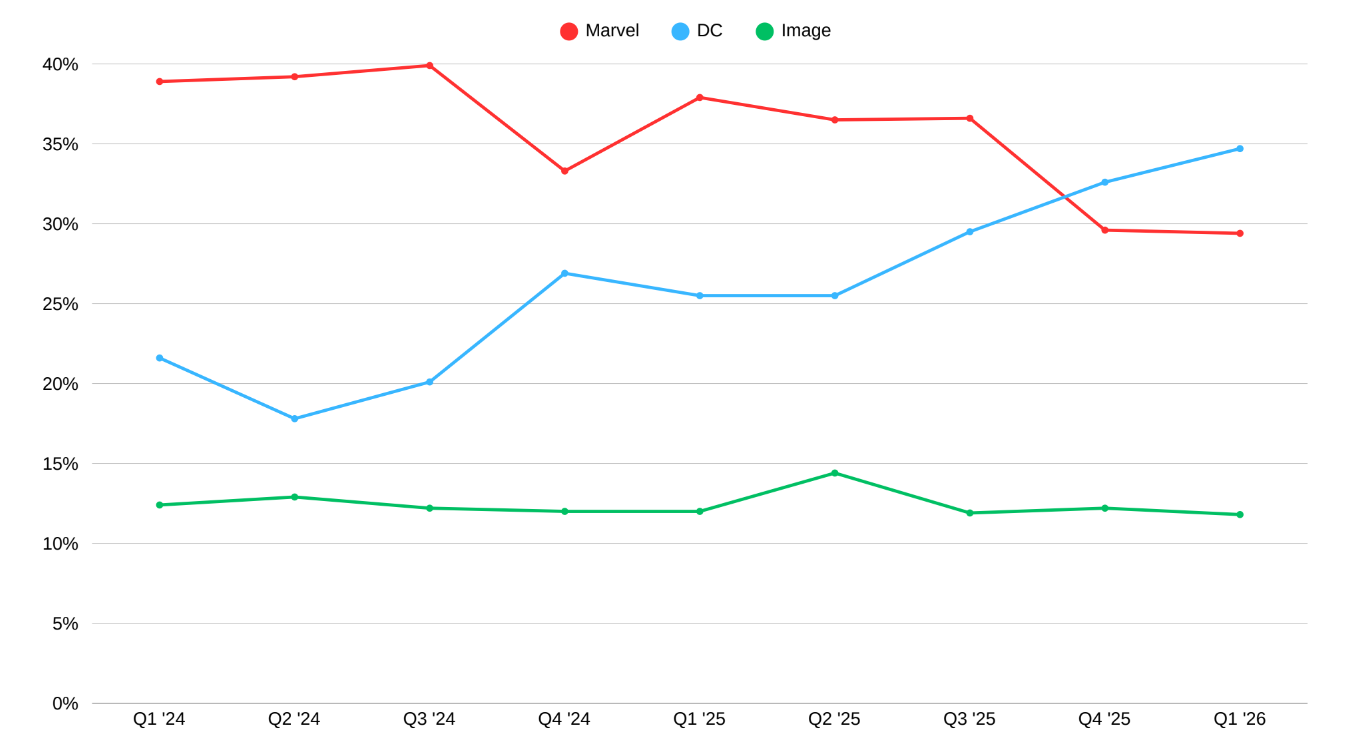 The latest direct market share numbers from ICv2 tell the story. In Q1 2026, DC held a 34.7% share compared to Marvel’s 29.4%. It wasn’t until Q4 2025 that DC supplanted Marvel, but looking at Marvel’s 37.5% and DC’s 25.5% in Q1 of last year, a concerning trend emerges. Going back further to 2024, before Marvel’s new strategy became palpable, their market share was around 39% compared to DC’s 20%, which dipped as low as 17.8% in Q2. The tables have turned: fast.
