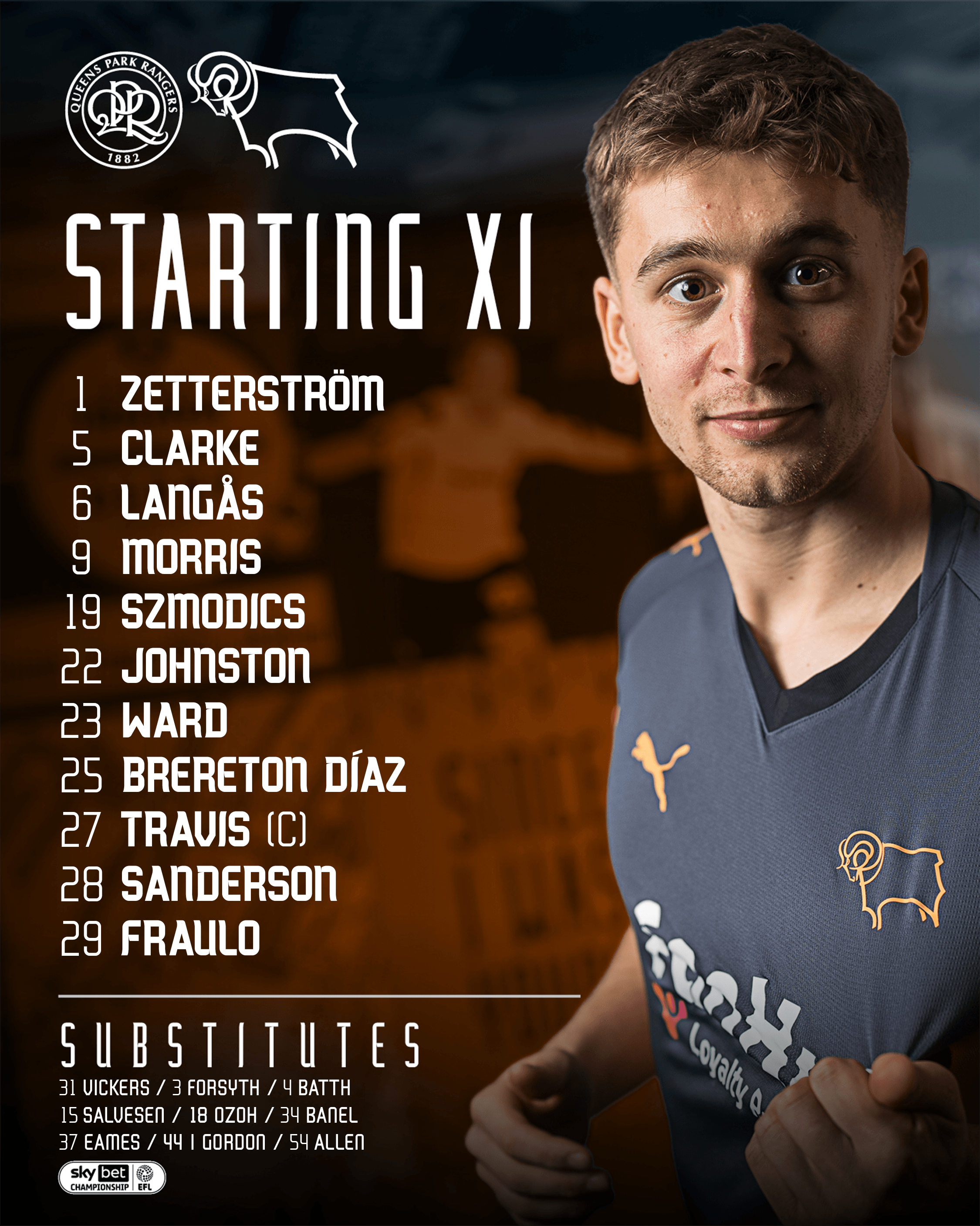 Derby County: Zetterström (GK), Clarke, Langås, Morris, Szmodics, Johnston, Ward, Brereton Díaz, Travis (C), Sanderson, Fraulo.