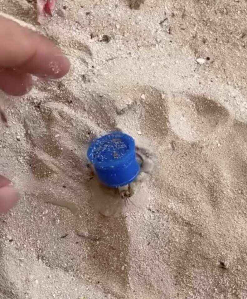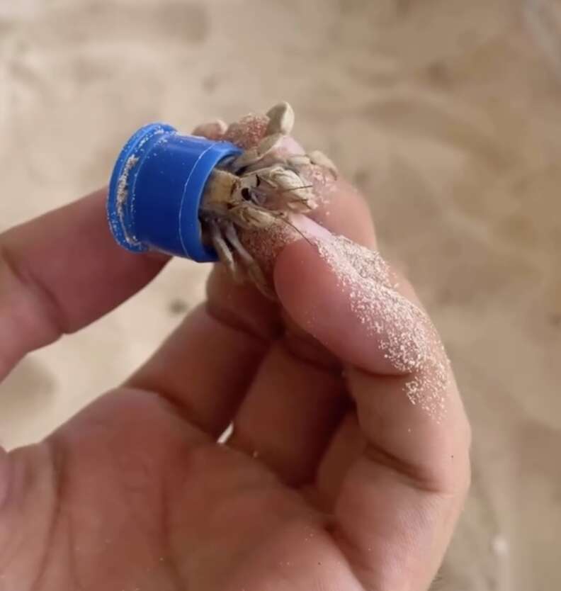 Turns out, it was a hermit crab, who, following his instinct to inhabit a seashell, had stumbled upon a piece of litter instead.