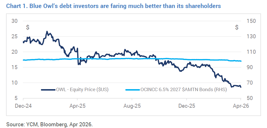 OWL’s share price is now down two-thirds from its peak in early 2025. By contrast, OWL’s Credit Income Fund $A bonds, which are effectively secured against the fund’s underlying assets, are less impacted and continue to hold their value (refer Chart 1). These bonds are protected by a significant equity cushion, with fund leverage at just ~0.7x, redemptions gated and a BDC mandated leverage covenant limit in place of 2x.