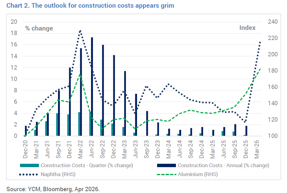 This brings us back to the current Iran conflict and the impact of inevitable cost escalations and higher interest rates on construction sites across Australia. Already weakened through the 2022/23 period of higher interest rates and cost escalations, property development/construction is enduring another round of higher costs (refer Chart 2) and constrained demand. For instance, since the commencement of hostilities, naphtha and aluminium prices – key components in plastic and metal building products – have increased by 85% and 20% respectively. Moreover, in being highly correlated (i.e. increased costs impact all developments similarly), a diversity of development exposures might offer only limited protection from credit losses given the systemic risk profile.