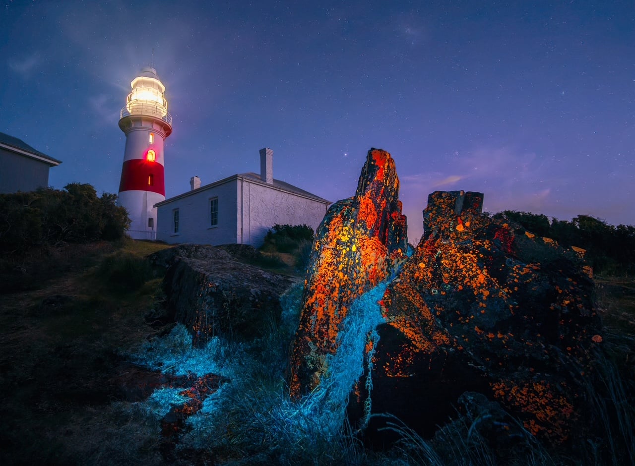 A lighthouse glows beside a small house on rocky terrain under a vibrant night sky, illuminated with stars, the Milky Way, and purple-blue auroras. The rocks and ground reflect blue and orange hues.Alldridge is an accomplished landscape photographer and has incorporated his biofluorescent skillset into some of his vista work.