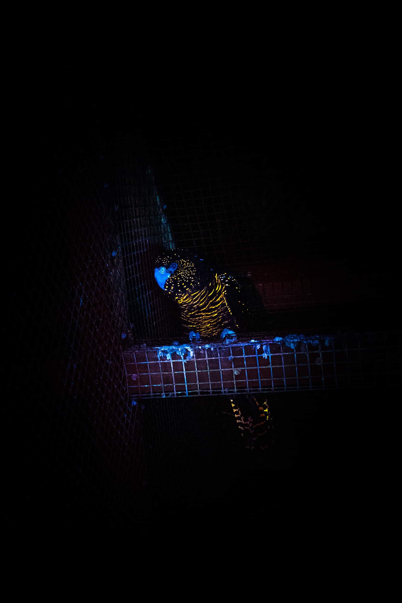 A close-up of an echidna with spiky fur, illuminated in blue light against a pitch-black background.Echidna A wombat is illuminated by vibrant blue and pink lighting, standing out against a dark background. The light highlights the fur and facial features of the animal.Wombat A bird with bright, neon-yellow stripes is perched on a wire shelf, illuminated under blacklight in an otherwise dark environment. The bird's face and beak are also highlighted by the light.Parrot