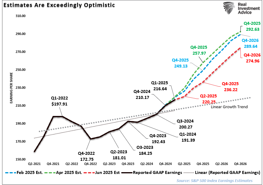We will see if that continues, but the tariffs have not been the disaster Wall Street expected. Nonetheless, the negative revisions are tied to concerns over tariffs under the current Administration, and the lack of finalized “trade deals” keeps forward estimates in flux. However, as we move into Q3 and Q4 of this year, the expectations are for a sharp increase in earnings in 2026, as shown.