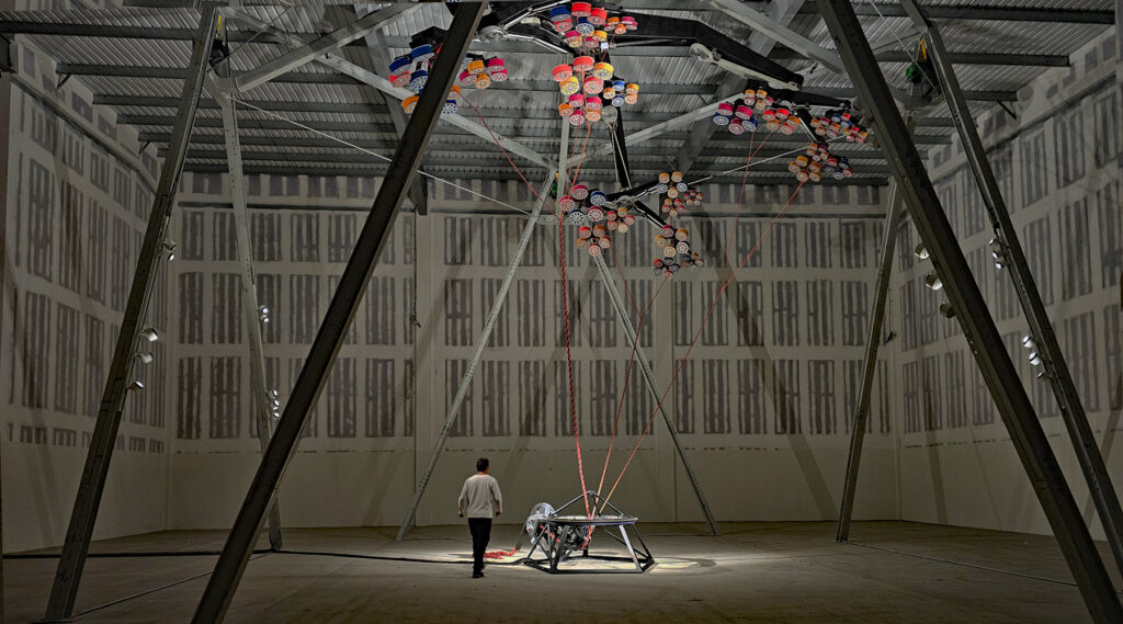 Over the years, the threads created by the artwork will pile up around it and become a giant softplay area where you can relax and watch the spooling working above your head.