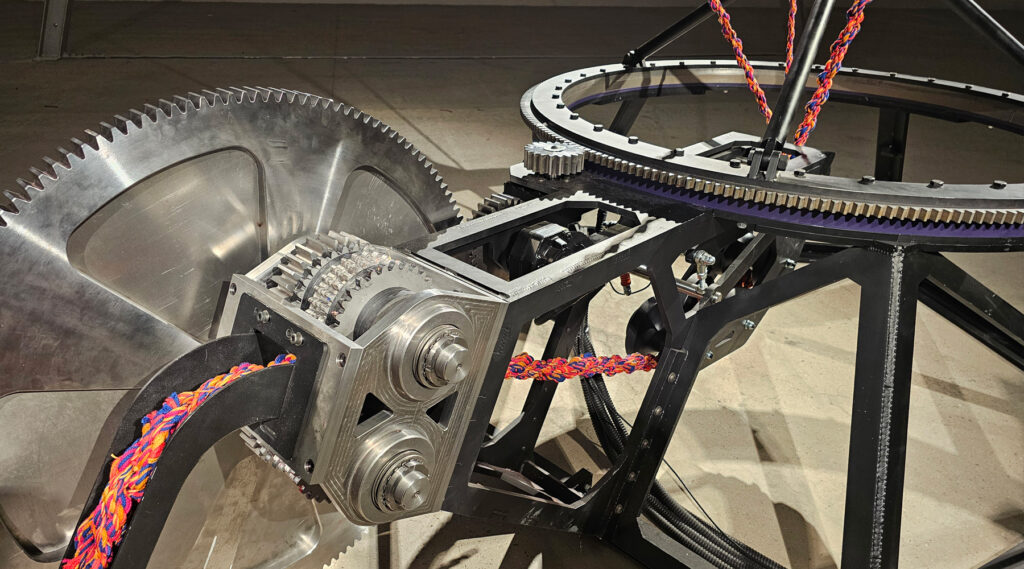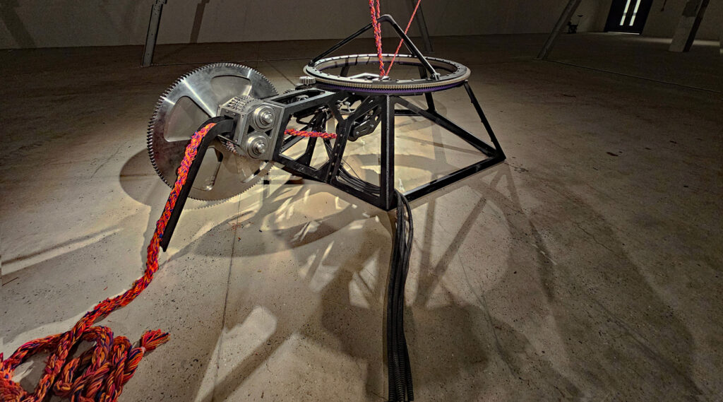 Umbilical is the result of a lifetime’s work experimenting with mobile sculptures, many of which are inspired by the idea of weaving threads and are part of his “rope makers” series. At a glance, it’s obvious what’s going on – a large structure slowly rotating within rotations above your head feeds threads down to a clockwork machine that twists them into a thick rope, which will slowly pile up around the room.