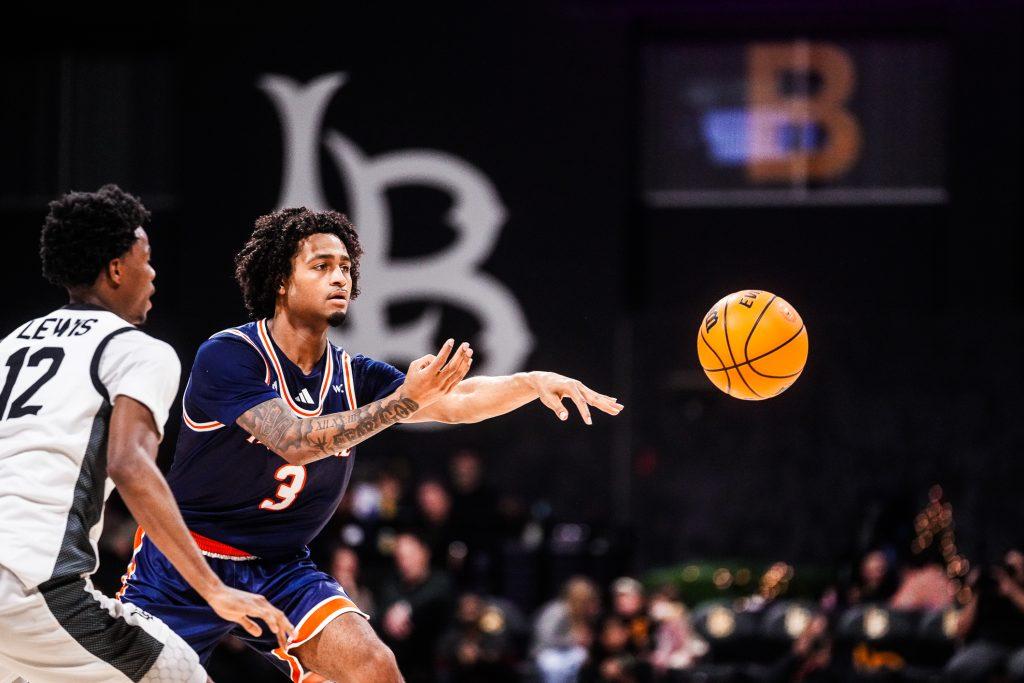 Redshirt sophomore guard Aaron Clark passes the ball in a game against Long Beach State in the LBS Financial Credit Union Pyramid on Dec. 18. The Waves had 18 turnovers to Long Beach’s nine throughout this game.