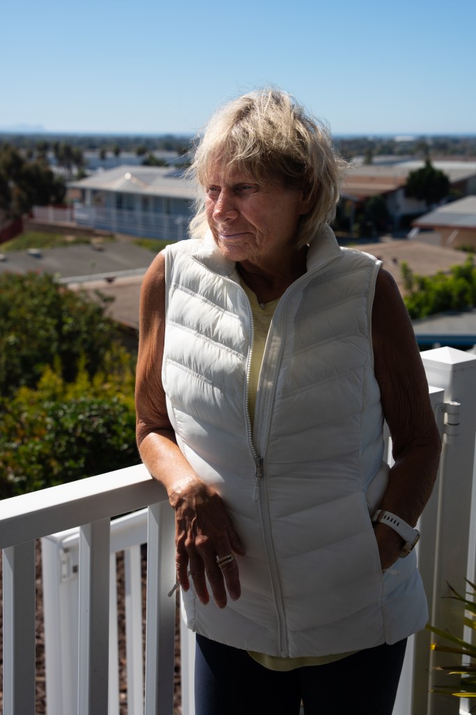 Alana Shapley, who joined the Frantz Law Group lawsuit, stands on her balcony overlooking the Tijuana River Valley on Oct. 17, 2025. Since moving to the area Shapley has suffered asthma, headaches, nausea and also contracted an autoimmune disease which caused her hair loss. (Philip Salata/inewsource)