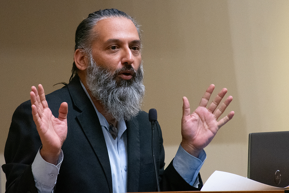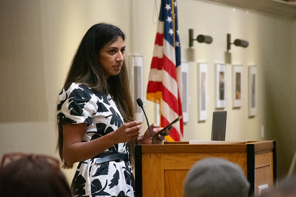 Dr. Farah Karipineni spoke about mutual aid and solidarity with the people of Palestine. Photo by Chris Schneider