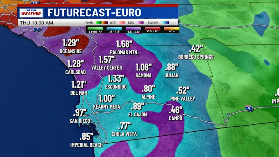 As of Saturday night, models show that parts of San Diego County could see over an inch of rain by Thursday morning.