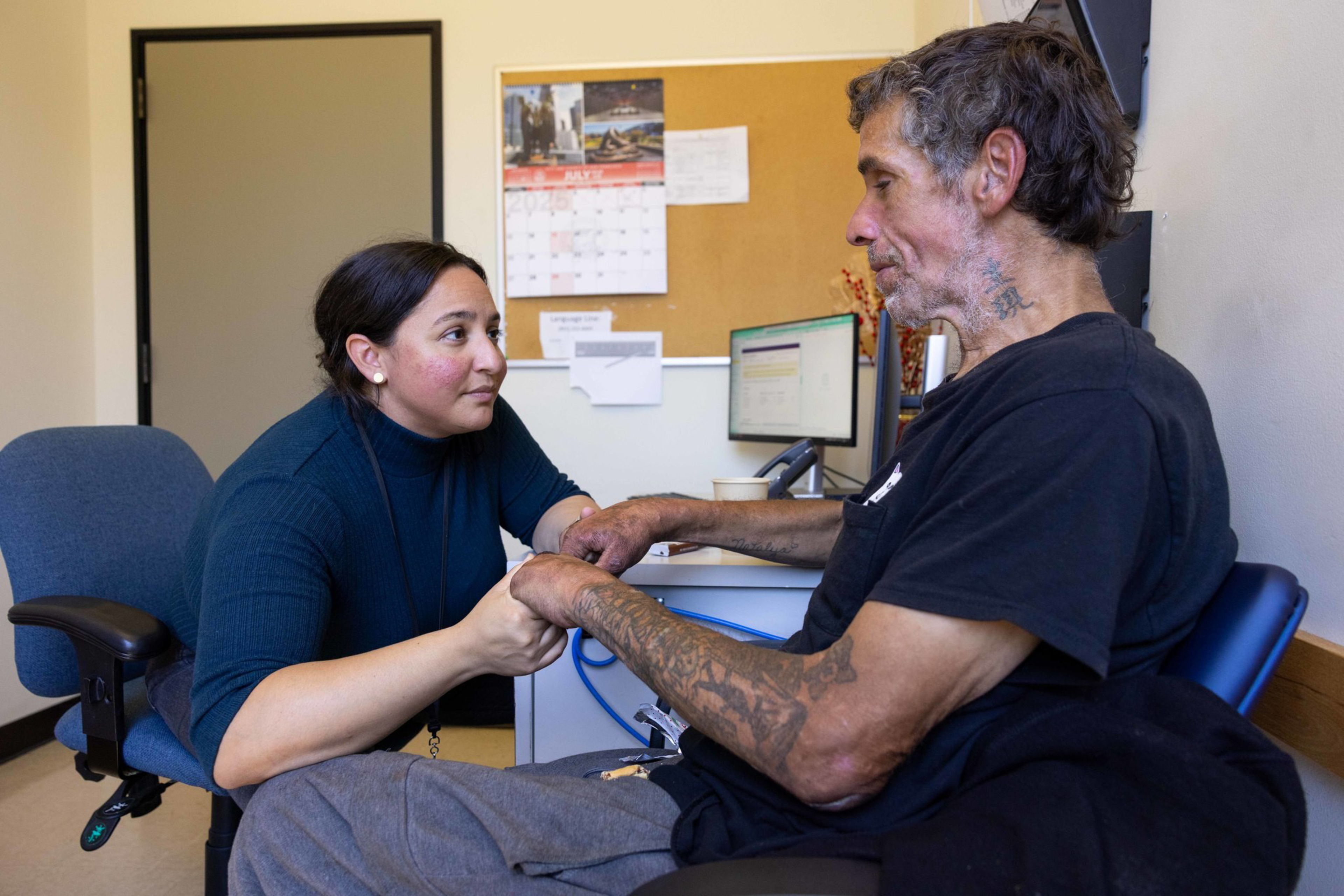 Dr. Noelle Martinez, an addiction medicine specialist with the Department of Public Health, holds Rudy Batka’s hands during a visit to the Behavioral Health Access Center.
