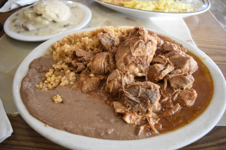 A plate of chile verde at Al’s Cafe. The chile, typically green, is red given the recipes lack of tomatillos. The recipe is from the diner’s namesake, Al Contreras. Pablo Orihuela | Fresnoland