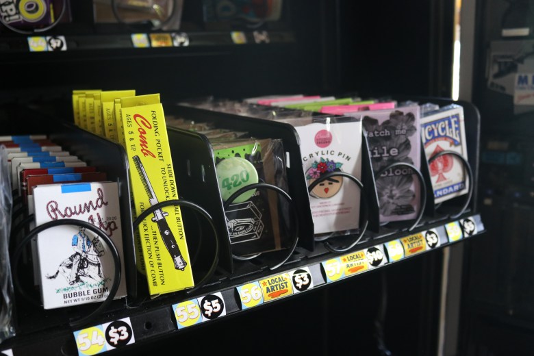 One row of goodies inside the JoyStick Vending machine includes a packs of bubble gum, switchblade combs, button and acrylic pins, an artist’s prints and playing cards. The vending machine has been inside Goldstein’s Mortuary and Deli for about two weeks. Omar Rashad | Fresnoland